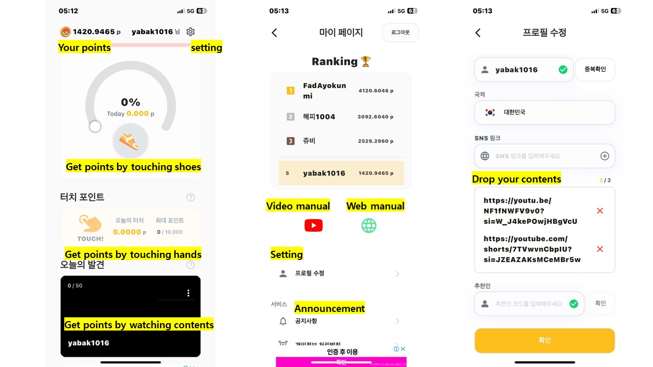 - 화면 터치로 활동 포인트 적립