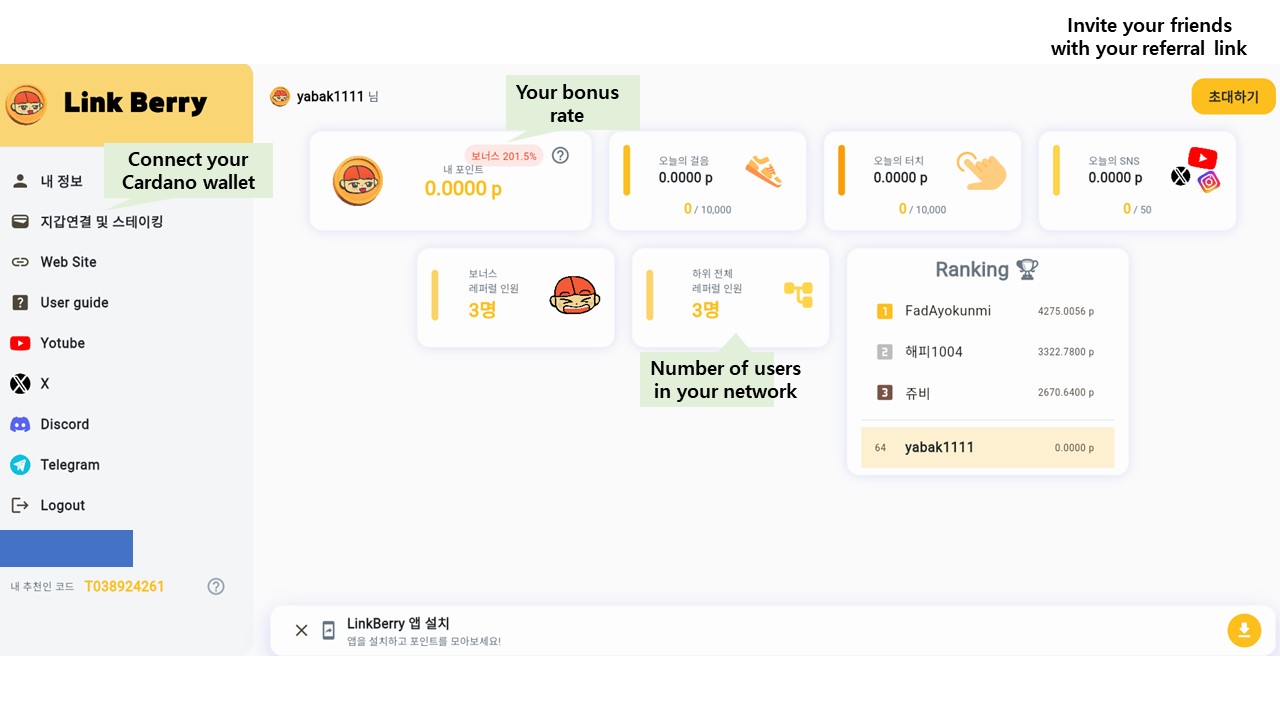 LIBE 풀에 100 ADA 이상을 스테이킹하면 모든 앱 활동으로 얻는 포인트에 100% 보너스가 추가됩니다. - 초대 링크 보너스: