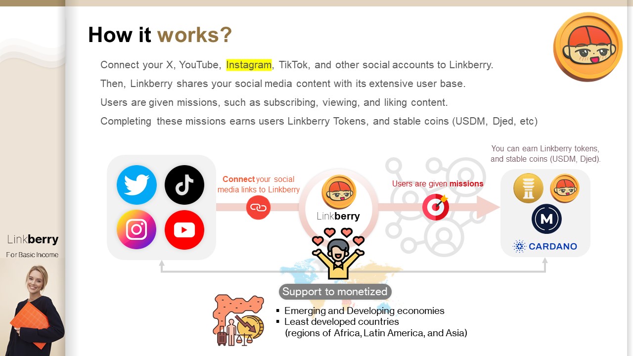 Linkberry is a next-generation app that allows users to earn points through simple activities such as walking, interacting with their screens, and supporting others' social media accounts. These points can be exchanged for tokens minted on the Cardano Blockchain, which can, in turn, be converted to real-world currency. This unique ecosystem enables users to monetize their everyday activities and online interactions, creating a path for financial independence.